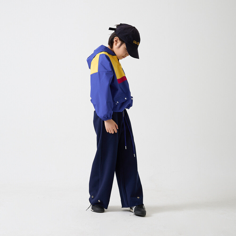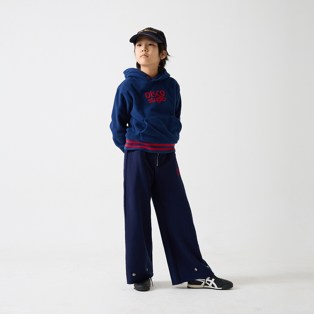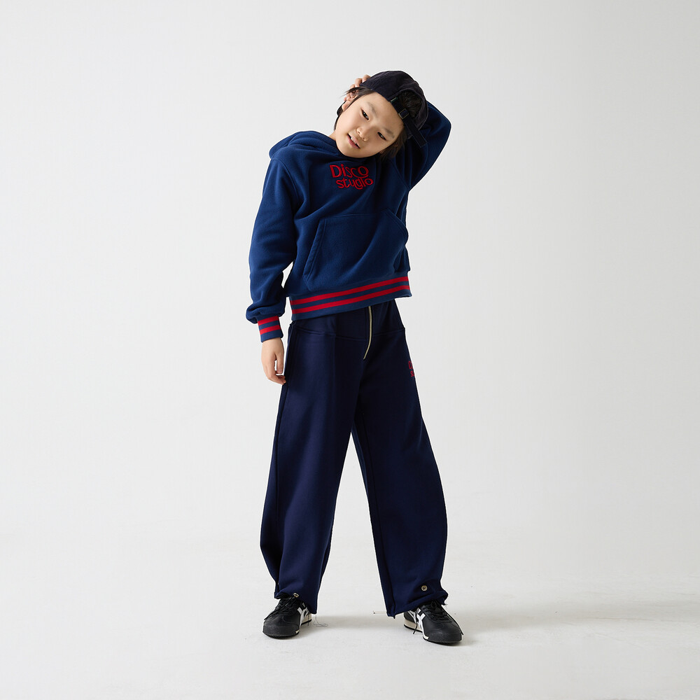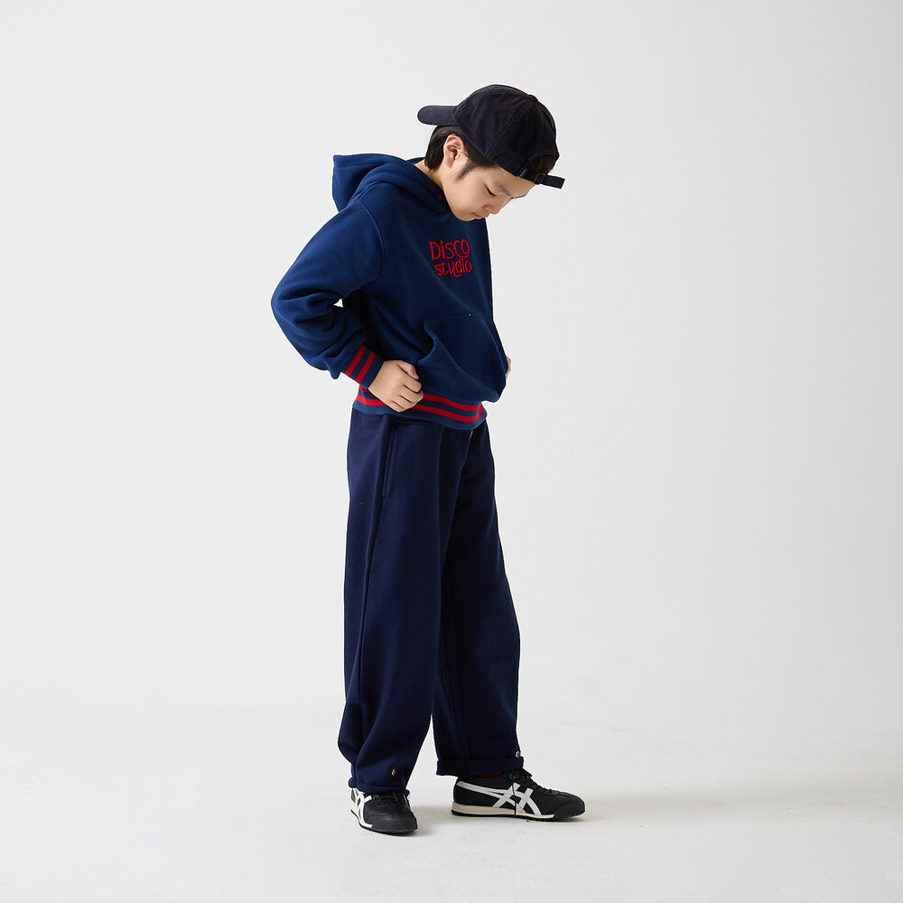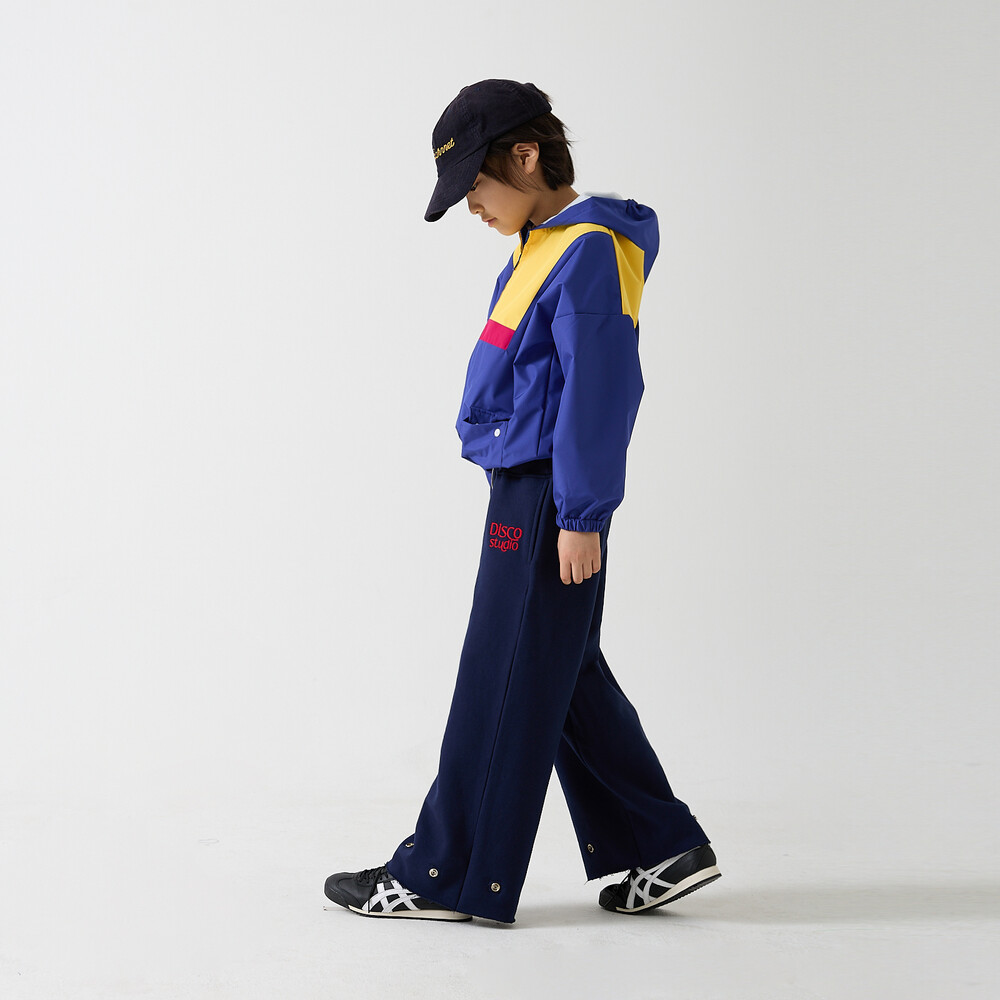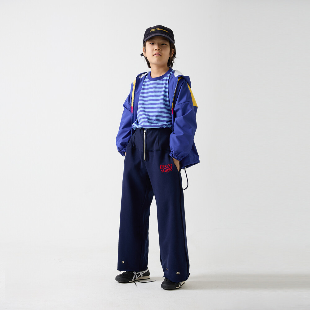 허리 밴딩 아래로 툭 떨어지는 일자핏 트레이닝 팬츠로