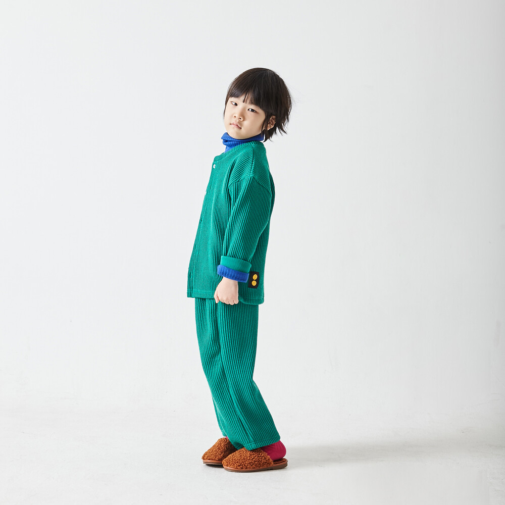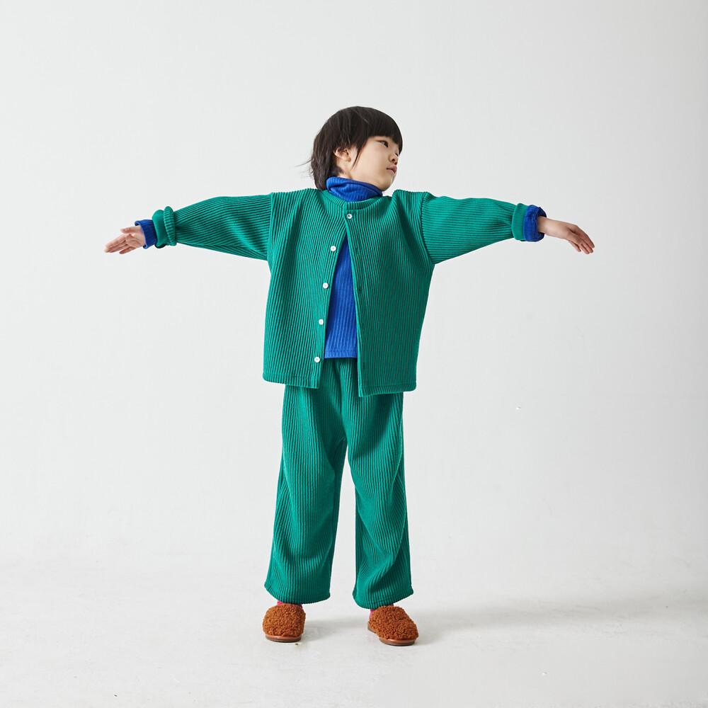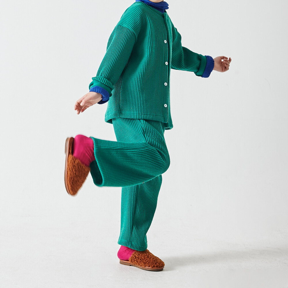 추러스를 닮은 굵은 골지 니트 원단(면, 레이온, 아크릴 혼방)의 상하복으로